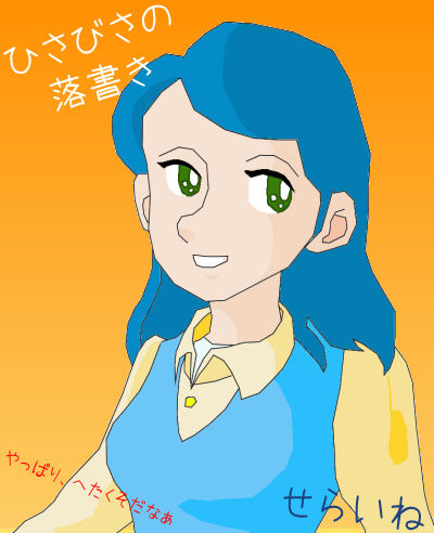 さて、そんな事を考えているうちに、私の画風って、どんなのだっけ?とおもって、久々に落書きして見ました。PCのお絵かきソフトでフニフニと描いてみたんですけど、やっぱへただぁ(笑)。色々なポーズを、自然な雰囲気でかけるようにしないとだめですね~。構図もメチャメチャで、画像を左右反転させると、顔の部品が中央よりずれてるのも良く分かります。まぁ、ちゃんとした勉強してないから、しかたないですよね。^^;